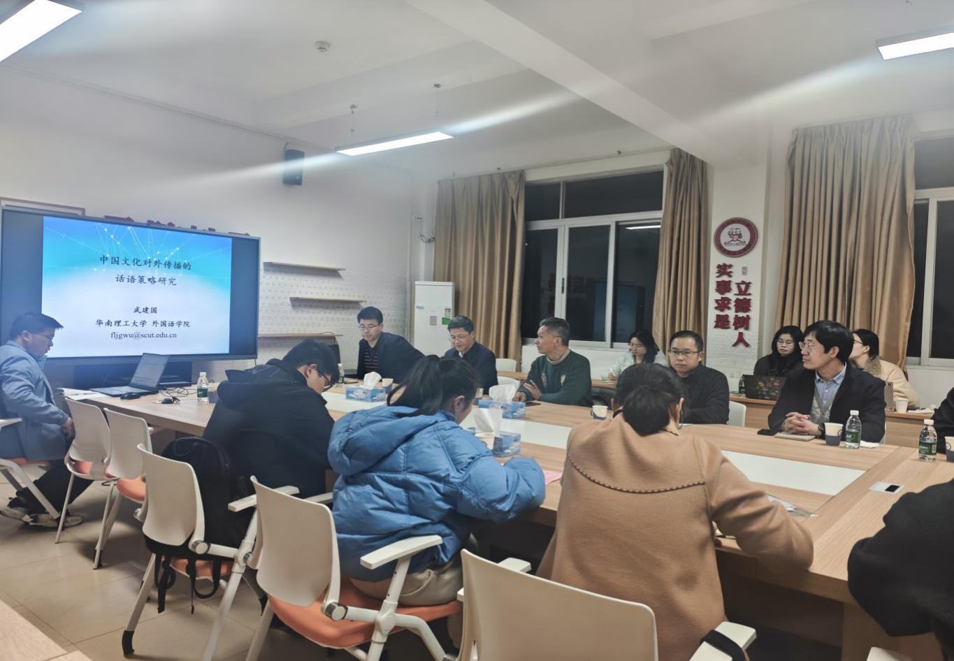 本网讯 为助力中国文化国际传播能力提升,探寻数智时代文化对外传播的创新路径,12月12日,我院特邀华南理工大学教授、博士生导师武建国开展以“中国文化对外传播的话语策略研究”为主题的学术讲座。讲座由我院副院长王经北主持,马克思主义学院、外国语学院等师生共同参与这场兼具理论深度与实践价值的学术交流。